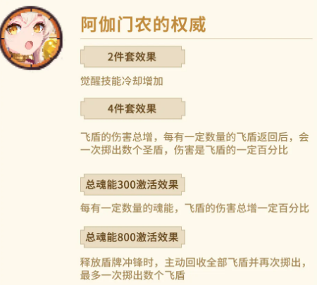 首套圣魂「阿伽门农的权威」聚焦飞盾流派重构。两件套缩短「决胜日战征」冷却时间,提升技能使用频次;四件套增强飞盾基础伤害,并引入“圣盾返投”机制——当满足指定数量飞盾回旋条件时,自动掷出多个圣盾,其伤害为飞盾当前伤害的固定百分比。魂能达300点时,每累积一定量飞盾伤害,即触发额外伤害增幅;魂能满800点后,释放盾牌冲锋可强制召回全部在场飞盾并重新投掷,单次最多生成多枚圣盾,爆发节奏紧凑,适合偏好高机动远程压制的玩家。