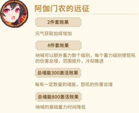 第二套圣魂「阿伽门农的远征」以怒吼系技能为核心驱动。两件套提升元气获取效率,缓解前期资源压力;四件套扩展呐喊蓄力等级上限,每增加一级蓄力,怒吼的基础伤害、作用半径及冷却缩减均同步提升,形成“越蓄越强”的正向循环。魂能300点激活怒吼伤害总增加成;魂能800点效果虽未完全公开,但整体设计倾向长线节奏掌控,契合偏好战略预判与高爆发窗口管理的玩家风格。