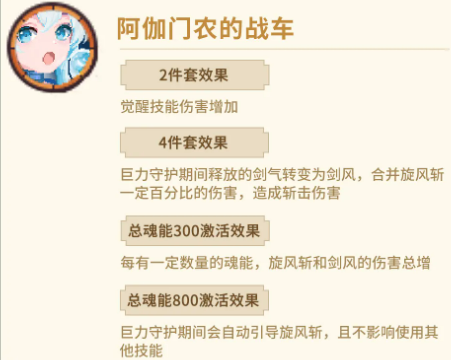 第三套圣魂「阿伽门农的战车」深度绑定近战连携体系。两件套直接提升「决胜日战征」技能伤害,收益直观;四件套实现在巨力守护状态下,所有剑气转化为剑风,并与旋风斩融合为统一斩击伤害源,强化技能协同性。魂能300点提升旋风斩与剑风的伤害总增;魂能800点触发关键质变:巨力守护期间自动持续引导旋风斩,且全程不影响其他技能施放,同时降低呐喊基础蓄力所需时间。该套装高度适配贴身压制型打法,视觉表现与实战反馈兼具强度与流畅感。