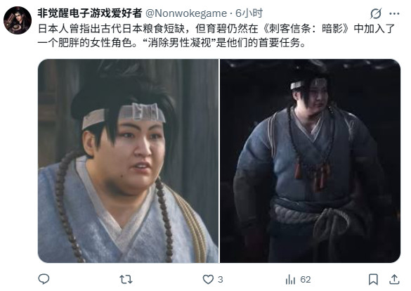 随后有玩家翻旧账,指出背景设定在日本封建时代的《刺客信条:暗影》,尽管当时面临吃不饱饭的问题,但育碧还是义无反顾地加入了肥胖女性角色NPC:
