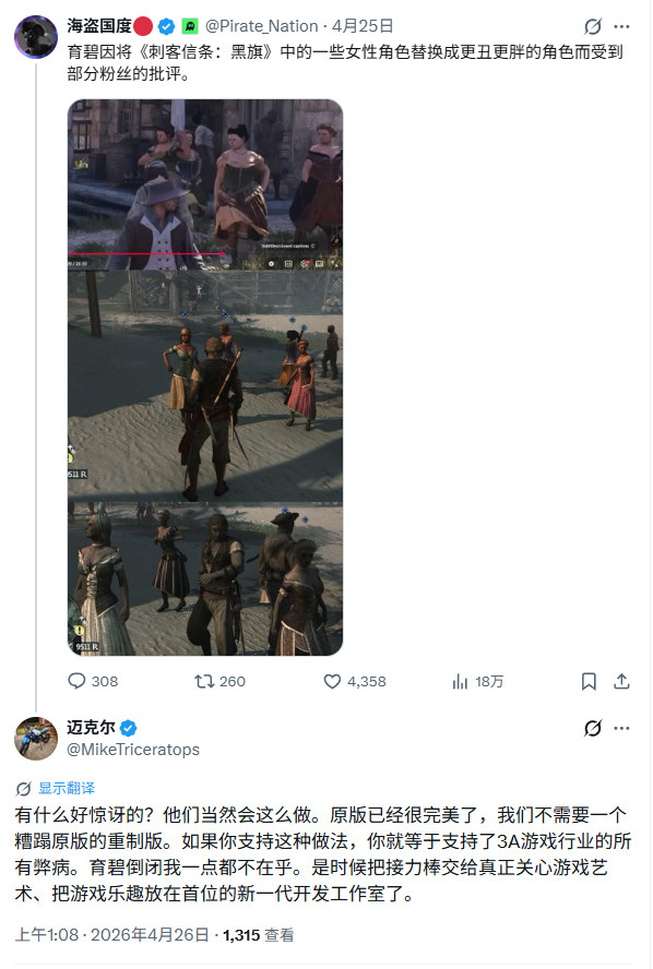 《刺客信条:黑旗 记忆重置》被吐槽 偷偷把妓女变成又胖又丑