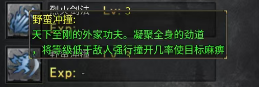 还有野蛮冲撞,是属于战士前期能够带来的不错防御功能,一般用到这个技能的时候会用到战士身上的劲道数值,而且只要是敌人等级低于战士的情况下,他在这里利用野蛮冲撞的技能效果可以将敌人强行给撞开,而且有一定的概率让这些敌人处于麻痹状态当中,这个效果其实在清怪的时候也有一定的好处可以用。
