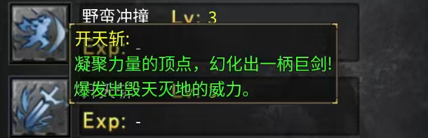 而开天斩的话前期也是比较容易解锁的,这个技能效果当中大家可以看到通过凝聚前期力量属性的效果,发出一个蓄力攻击,而且此时特效当中还会有一个巨剑的状态出现,对敌人来说造成的输出威力也是比较高的,通过此类技能搭配的呀,可以发挥好战士这个职业目前比较多的输出效果。