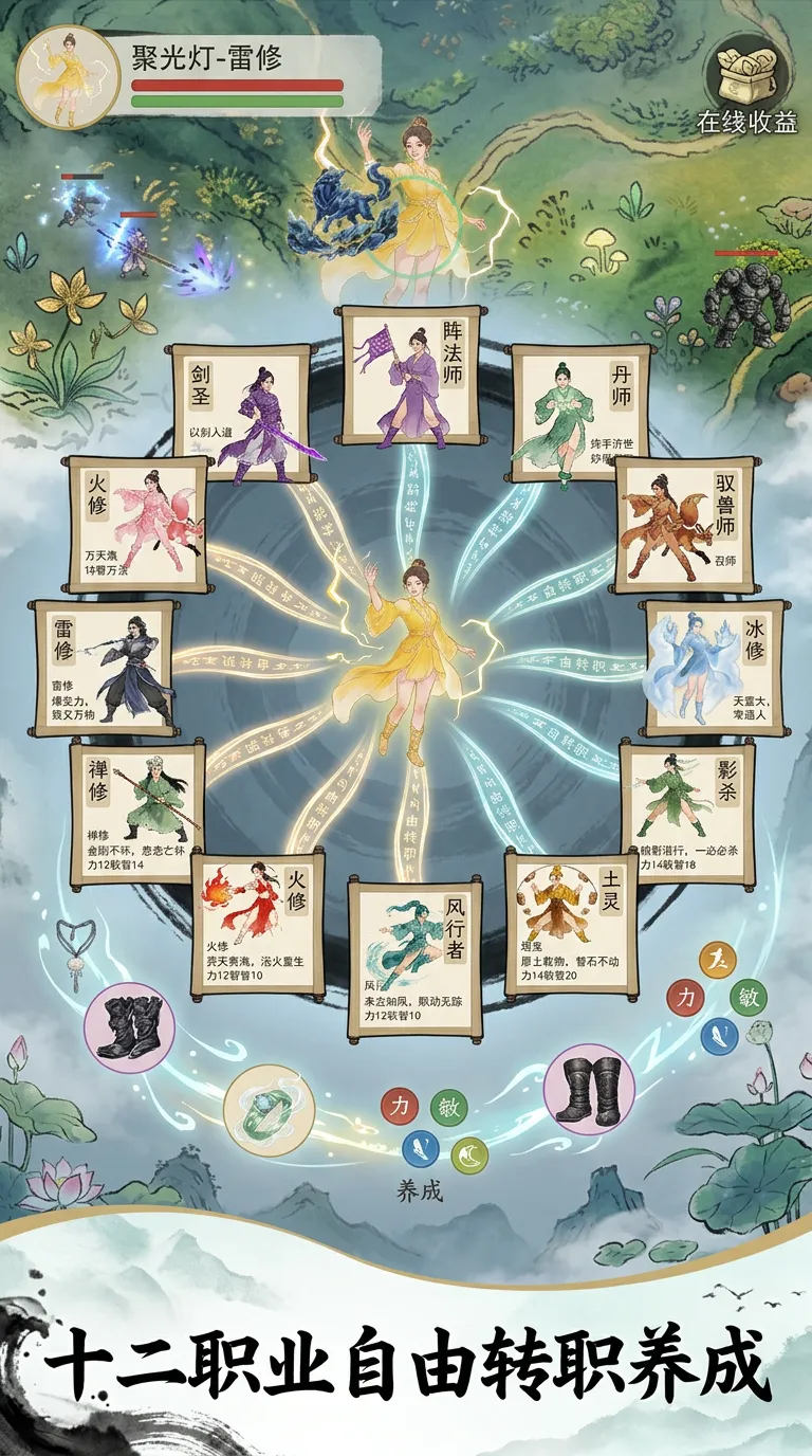 游戏提供差异化职业专精体系,例如开局选择雷修职业,即可激活「天雷专精」特性,具备范围群攻优势,清怪效率突出,特别适配前期快速升级需求。属性加点方面,主输出流可全额投入智力以最大化伤害;若更倾向稳健发育、规避副本死亡惩罚,则建议适当分配点数至体力属性,提升生存容错率。