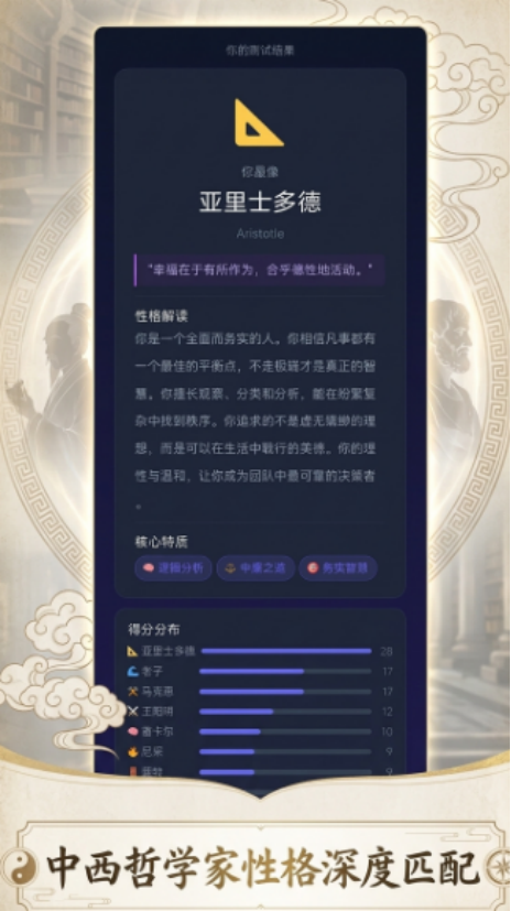 区别于传统答题类游戏,本作将哲学史知识自然嵌入题干逻辑中,每道题均对应特定流派的核心命题,如“性善性恶之辩”“自由意志是否存在”“幸福是否可被定义”等。玩家在作答过程中,不仅获得个性化哲学人格报告(含匹配度百分比、思想特征解读及延伸书单),还能解锁哲学家小传、经典语录与思想图谱,真正实现“玩中学、学中思”。游戏全程无战斗、无体力限制、无强制社交,操作极简,适配碎片化时间场景。