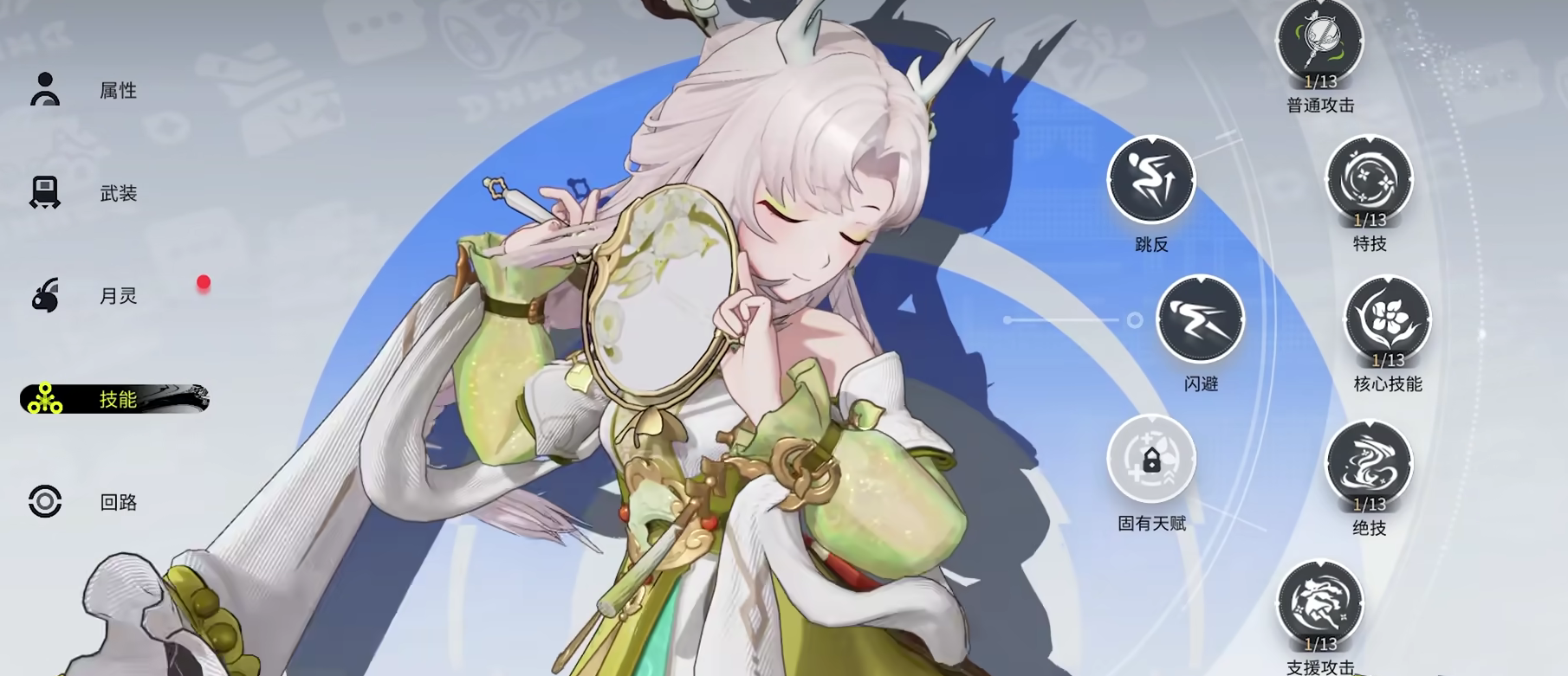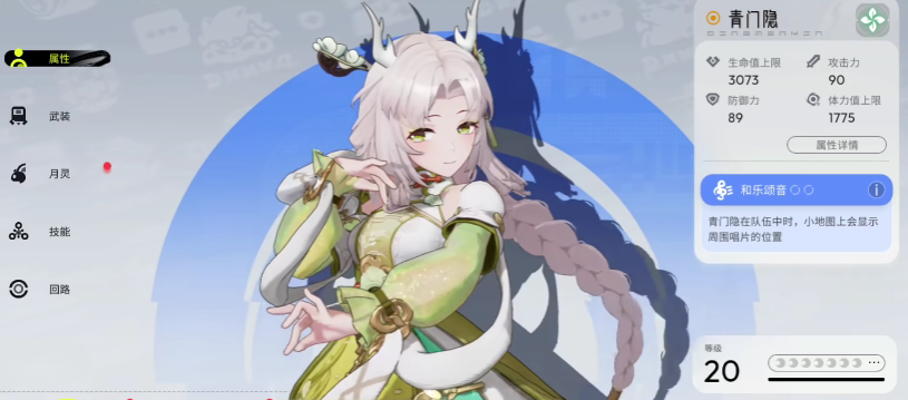 青门隐外观设计极具东方美学特征:雪白麻花辫、素雅服饰、灵动身姿,整体形象契合国风审美体系。所有主动技能均围绕“音律”与“舞势”展开,兼具治疗、增益与中等输出能力。角色成长依赖技能树系统,加点策略明确——优先提升治疗量,其次强化生命值上限,最后才考虑攻击属性分配。