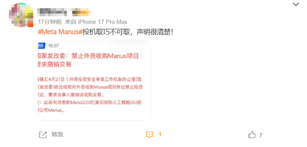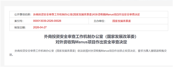 今日,国家发改委下属外商投资安全审查工作机制办公室正式宣布,依法禁止美国Meta公司收购中国背景AI企业Manus项目,并要求相关方撤销已完成交割的20亿美元(约合人民币140亿)交易。