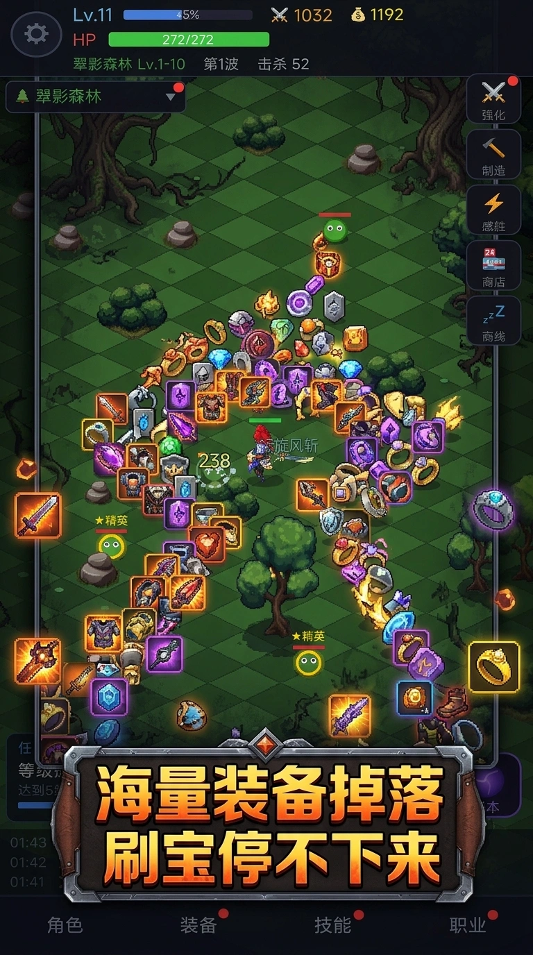 游戏以“动态刷宝”与“深度构筑”为双主线驱动:面对如潮水般持续刷新的敌群,玩家可享受高强度连击带来的视觉与操作双重爽感;每次击败目标均会掉落随机词缀装备,支持重铸、通货转化及词条精炼等多重加工方式,助力打造个性化终极战装。同时内置智能挂机系统,离线期间仍可持续积累资源,大幅降低养成门槛。