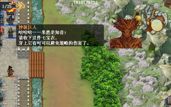 派时迁或者王英去(22,1)触发钟鼓巨人,按2-2-1-1-1-2-2-1-2-1-1-1-2-2敲击获得宝物-七宝衣(注:触发此剧情前尽量不要攻入城中或者触发伏兵剧情,要不然会拿不到)