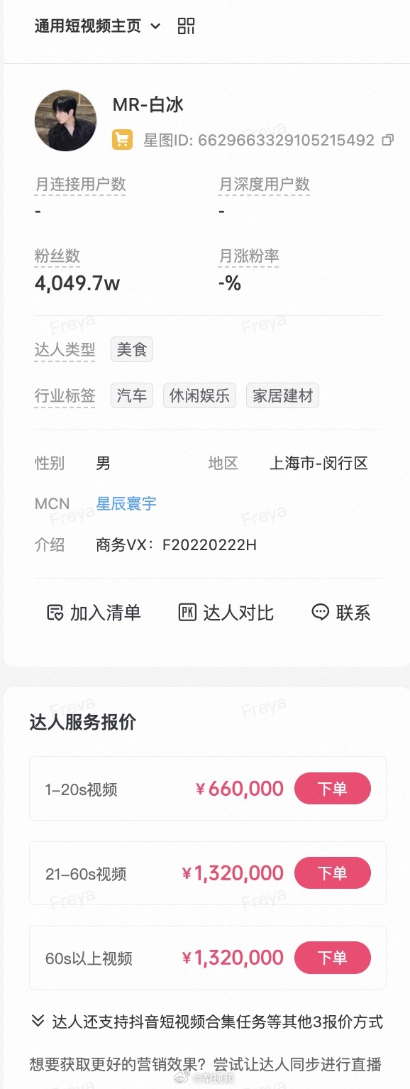 白冰1-20秒视频报价66万,21-60秒和60秒以上视频报价均为132万。
