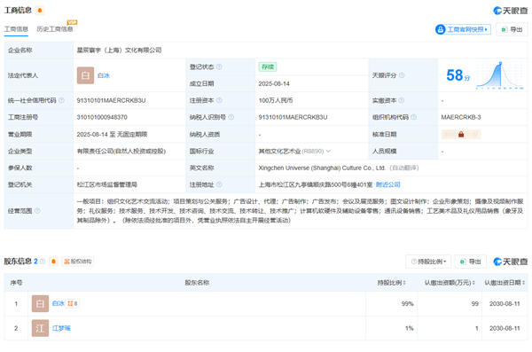 天眼查显示,白冰关联MCN星辰寰宇(上海)文化有限公司成立于2025年8月,法定代表人为白冰,注册资本100万人民币,由白冰、江梦瑶分别持股99%、1%。