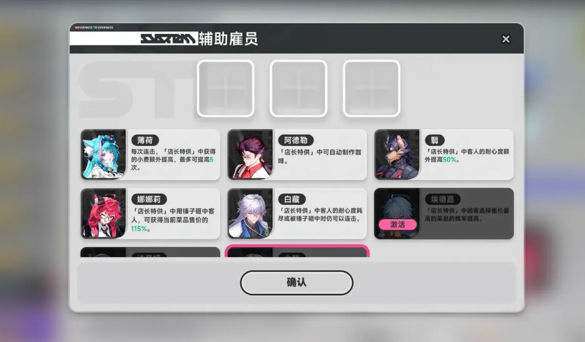 角色技能直接影响岗位适配效率:具备调酒专精的角色应安排至吧台服务,烘焙熟练者更适合驻守甜品工坊。除基础履职外,还可利用员工技能研发新品,或对现有商品进行品质升级,从而增强顾客复购率并拉升单客消费金额。
