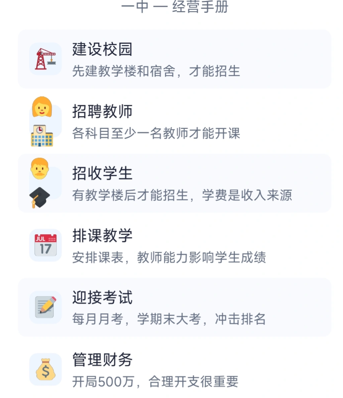 本作采用纯文字交互驱动,构建高度策略化的校园管理框架。开局即获得学校基础档案:在校生规模、年度预算、基础设施评级、教师编制数量等核心数据一目了然。玩家需据此制定财政支出优先级,例如优先扩建实验室以提升升学率,或加薪引进骨干教师增强教学实力。