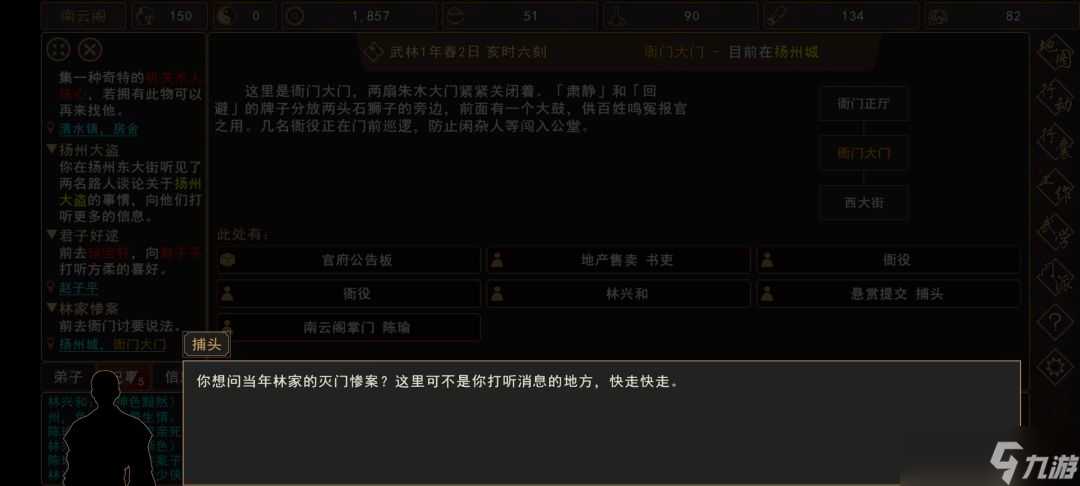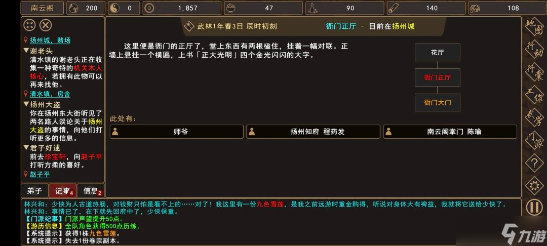 (1)前往 扬州城→衙门大门,触发过场剧情,剧情后获得知府手令(非任务物品)。