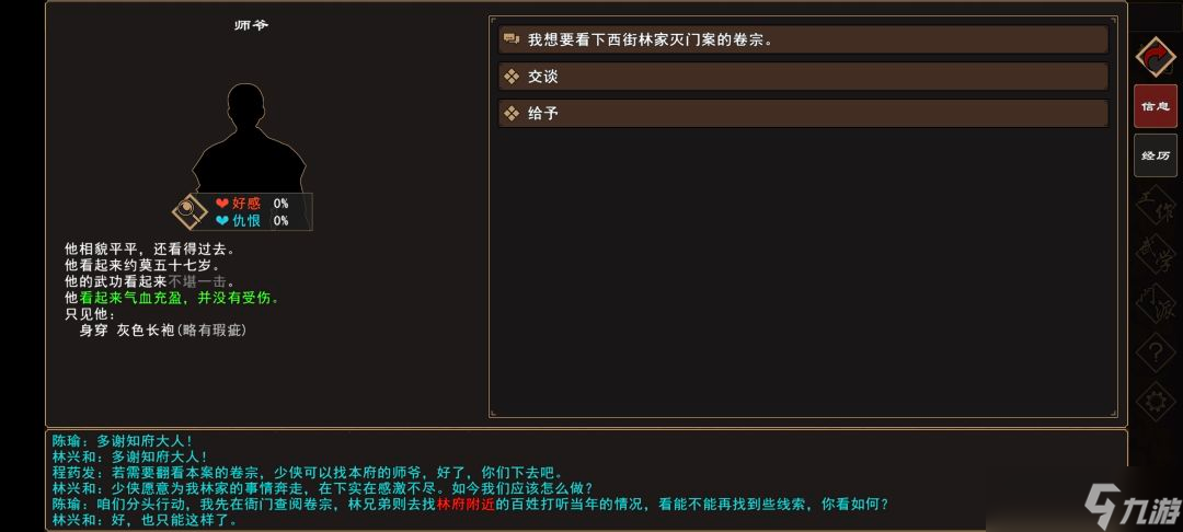 (2)前往 扬州城→衙门正厅→[人物:师爷]对话 选择:“我想要看下……”,获得:[卷宗副本※任务],打开行囊,选择阅读卷宗,获取案件细节。