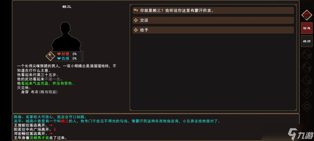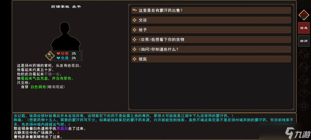 (3)前往 扬州城→百芝堂→[人物:药铺掌柜 吴平]对话 选择:“这里是否有……”,过场剧情后获得[人物:赖三]的线索。