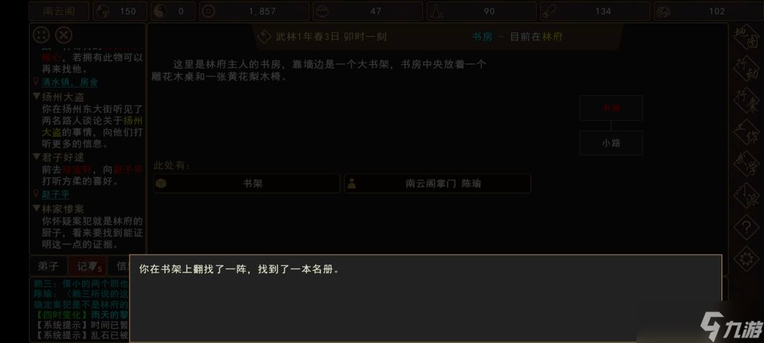 (5)前往 扬州城→林府→书房,选择书架 查看 书册,触发过场剧情,剧情后验证怀疑(厨子:朱长贵)。