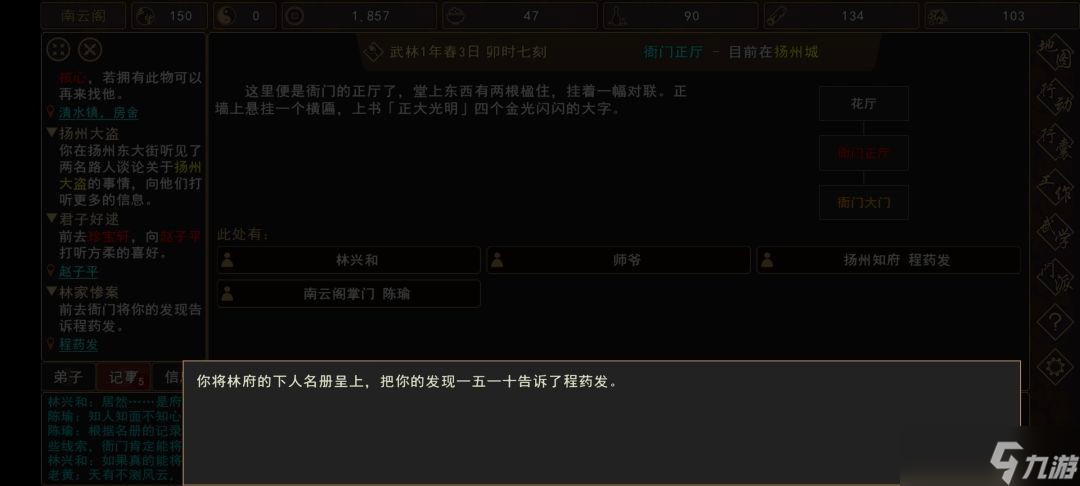 (7)前往 扬州城→衙门正厅,触发过场剧情(向[人物:扬州知府 程药发]汇报),完成任务:【林家惨案】。