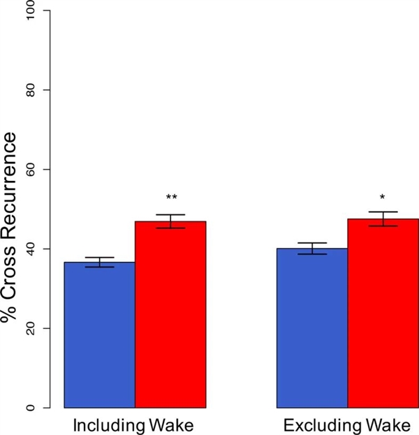 与单独睡眠(蓝条)相比,共同睡眠(红条)中睡眠阶段的完全、直接同步性显著增加,甚至近一半的夜间睡眠都是同步的,图片来源:参考文献 [1]