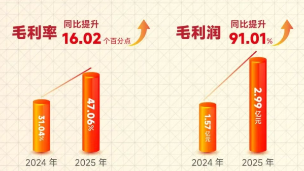 2025年公司毛利率达到47.06%,比2024年提高16.02个百分点,毛利额从1.57亿元增加至2.99亿元。
