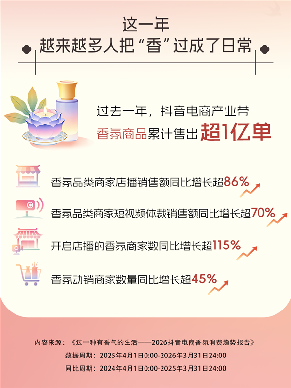 4月29日,抖音电商发布《2026抖音电商香氛消费趋势报告》(下称“报告”),呈现过去一年平台上产业带香氛商品的销售情况、用户消费偏好与内容生态变化等趋势。