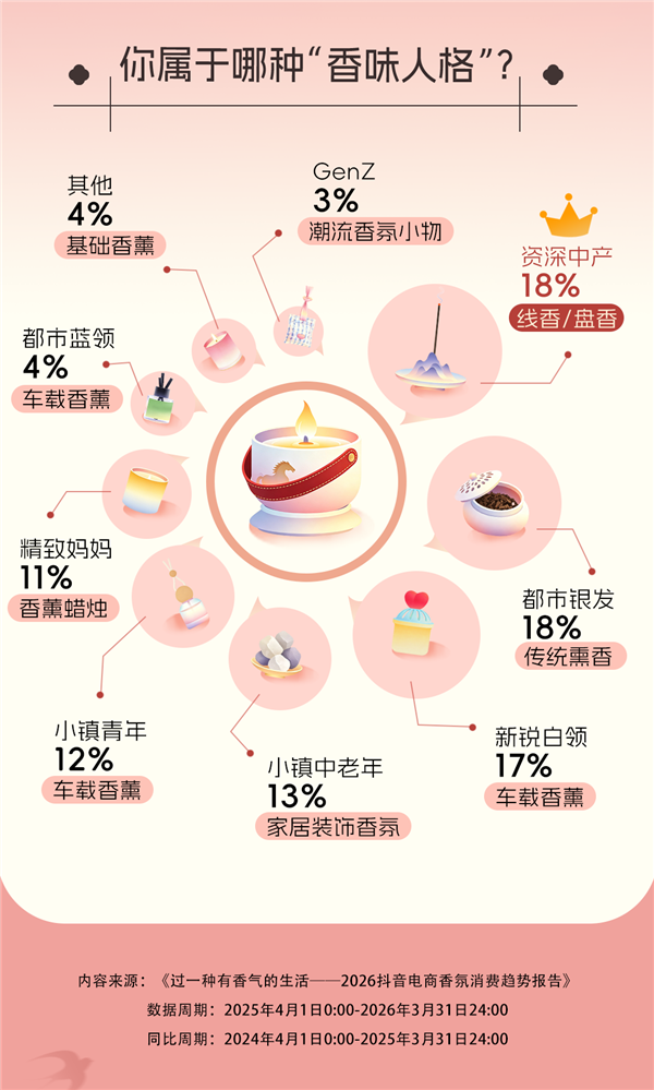 不同消费人群也呈现出差异化偏好。报告显示,资深中产偏爱线香、盘香,银发族偏好传统熏香,新锐白领和小镇青年更关注车载香薰,精致妈妈则更青睐香薰蜡烛。