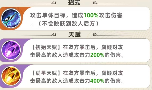 天赋功能在这里一定是在其他的成员触发了暴击之后,才可以带来这样的攻击效果,而且虞姬针对的都是目前敌方主要的输出角色,一次性的输出伤害百分比也不低,另外在满星的天赋效果当中触发的条件是一样的,所以在此时搭配的队友效果当中一定要触发更多的暴击,他们才可以让虞姬这里的功能更好用一些,而在对攻击的敌人,攻击数值最高的那个敌人造成伤害的时候,这里满星的天赋强度带来的伤害是400%,相当于是比基础的强度高了两倍,所以在其中大家可以通过这样的效果来让我方的输出更强势一些,虞姬在战斗当中,其实她升星以及升级达到一定要求的情况下,后期升级也可以让她得到双重的加强效果。