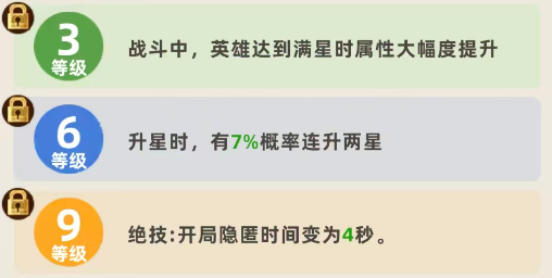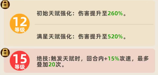 这里一般在达到6级的情况下,虞姬可以保证自己在升星的概率当中更多一些,快速升到两星,那么在等级提升到9级的情况下,这里虞姬的绝技会得到一定的强化,也就是在开局的情况下,她会得到一个隐匿的效果,目前对于这个类型的角色来说,隐匿还是非常有必要的,不管是隐藏自己的行动也好,还是在其中躲避敌人的针对性攻击也好,这个隐匿都是有用的,而且这里她的隐匿时间是有4秒的时间,让她在其中可以做出各种操作,后期如果想要接其他的角色上场,或者是升级的情况下,这里4秒也完全足够大家操作了,而在12级的情况下,她的初始天赋以及满星天赋都会得到强化,初始的强化会让她在一开始的天赋强度当中伤害,在暴击之后触发成功,会有260%的伤害加成。