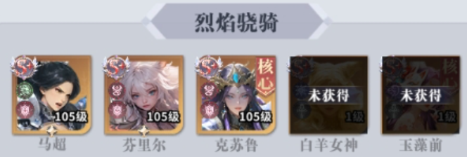 第三个阵容大家可以玩儿的是烈焰骁骑队,这个阵容里面大家可以用马超作为主要的输出核心,这套阵容里面因为用群英的角色比较多,那么后期搭配上有更多点燃状态的角色也是可以保证这个阵容里面的强度,比如说辉夜姬此类角色就可以搭配在其中带来足够的强势功能,这样造成了更多持续类型伤害效果之后还可以保证队内会有更多的引爆伤害,不过这个引爆伤害一般是在后期才可以爆发出来,前期要去加速叠加点燃状态,马超在场内如果跟同样群英阵营当中的角色一起上场的话,产生的契约,也就是羁绊效果还可以让她带来的破甲功能提升15%,所以在这里对于前排敌人造成的一个控制以及爆防能力还是比较厉害的,大家如果想要在突破前排的情况下,用马超来作为这里首要输出的角色是很不错的,另外玩这个阵容的情况下,大家就要注意场内如果有更多的神器加成效果一定要给她们搭配上,这样才可以玩儿的好这套阵容的强势能力。