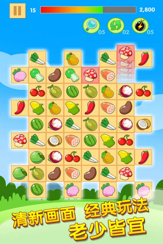18年上线的一个休闲消除手游,游戏采用的也是经典连连看规则,玩家只需连接路径转折不超过两次的相同水果图案就能完成消除,连续消除还能触发连锁特效,游戏关卡超过1200关,后期会加入冰块、锁链等障碍,关卡主题按照四季划分,水果和蔬菜图案交替出现,游戏没有内购,辅助道具可以看广告获取。