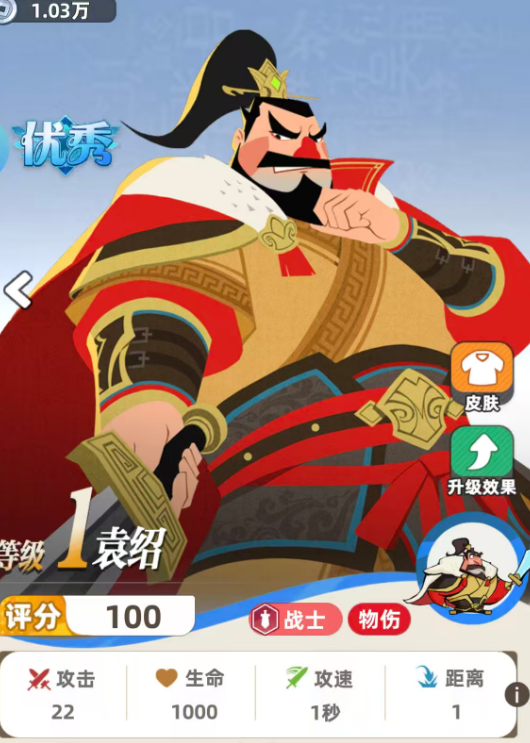 袁绍的基础属性设定偏向功能导向:作为近战单位,其攻击距离与攻速处于蓝卡战士的常规区间,但单次普攻仅提供22点基础物理伤害,输出能力有限,难以承担主C职责。其核心价值在于天赋机制——初始即拥有全体友方单位+20%物理伤害的光环效果。该加成直接作用于所有物理输出角色,尤其契合游戏中以战士为主力输出的职业结构;相较而言,法师依赖法术强度,射手侧重攻速与暴击,而袁绍所强化的恰是战士阵容最广泛、最刚需的伤害类型。