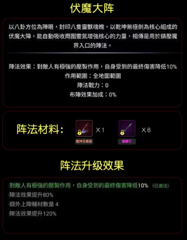 本套推荐阵容以功能性互补为核心,选用伏魔大阵、颠倒五行阵、次元杀阵、小五行阵、风雷阵与困龙阵六大核心阵法。其中,伏魔大阵具备全图覆盖型压制能力,可降低我方全体所受敌人最终伤害10%,且持续时间长,属于高优先级生存向阵法;颠倒五行阵则主打爆发输出,每10秒触发一次效果,对单体目标造成持续2秒的多段伤害,并有1%概率触发10倍致命伤害,虽触发率低,但一旦命中即可实现瞬杀。