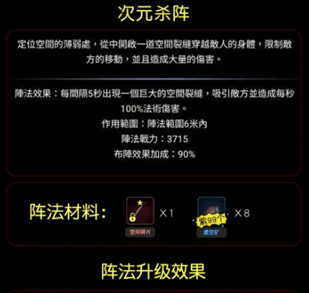 次元杀阵侧重战术控场与聚怪输出:每5秒生成一处空间裂隙,具备强制吸引范围内敌人的引怪机制,适用于前期清杂与BOSS战前集火准备;裂隙存在期间,范围内敌人每秒承受等同于其最大生命值100%的法术伤害,对法术抗性较低的单位尤为致命。小五行阵则承担团队防护职能,基于五行相生原理,每5秒生成一枚法力护盾,吸收相当于施法者20%法术攻击数值的伤害,护盾生效范围为8米,不可叠加,需配合冷却节奏进行持续布防,建议与输出型阵法协同部署以提升容错率。