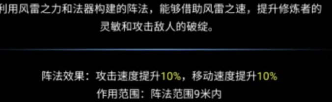 风雷阵强调机动性强化,需与法器类装备联动生效。激活后可在9米半径内为我方单位提供全面属性增益:攻击速度提升10%、移动速度提升10%,并显著增强灵敏属性,大幅提升角色走位、追击与闪避能力,是衔接输出与生存的关键过渡阵法。