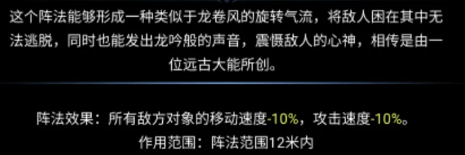困龙阵作为全场控场核心,以旋转气流形成12米超大作用范围,在区域内持续制造减速与降攻效果:范围内敌人移动速度降低10%、攻击速度降低10%。该效果与风雷阵的双10%增益形成完美对冲,实现“我方提速+敌方降速”的双重压制,大幅拉高单位时间内的有效输出窗口,是应对高机动性精英怪与团战拉扯场景的首选阵法。