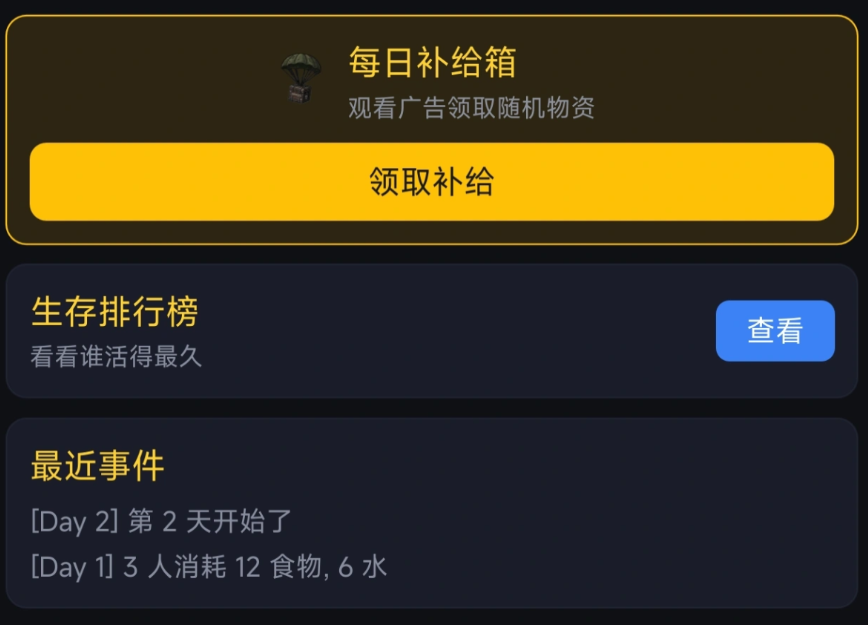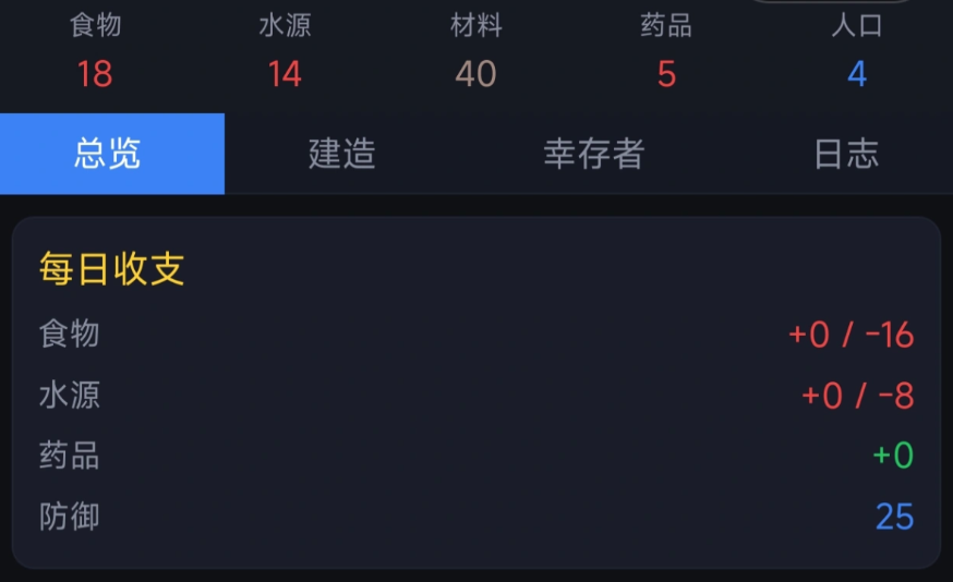 游戏开局即面临基础生存压力:初始仅拥有30食物与20水。即便不进行任何操作,每日固定消耗为6食物和3水。这意味着资源储备仅能支撑不到四天。因此,首日必须立即启动任务系统——通过完成日常任务获取额外补给。由于角色等级存在上限约束,前期资源分配需高度聚焦。优先升级农场可提升食物产量,而水井升级则直接增加水源供给。这两项建筑的等级提升应列为第一天的核心目标,确保温饱底线不被突破。