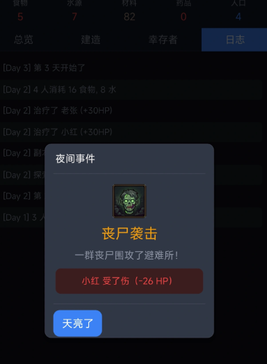 在资源积累到一定程度后,避难所本体升级即可启动,所需基础材料为42单位。值得注意的是,首次尸潮来袭前,防御体系必须初步成型。单座防御塔建造需消耗35材料,因此材料需求贯穿整个前期阶段。升级路线存在明显阶段性特征:当农场与水井升至可用等级后,应立刻转向瞭望塔与防御塔建设。此时避难所等级会直接影响人口上限,而人口增长又反向制约资源产出效率。三线并行(生产、防御、人口)对材料形成集中消耗,挂机所得远不能满足需求。建议采用“昼间经营+夜间应对”的双时段策略:白天专注建筑升级与物资调配,夜晚集中处理尸潮事件及随机危机,该节奏尤其适配前48小时的关键发育期。