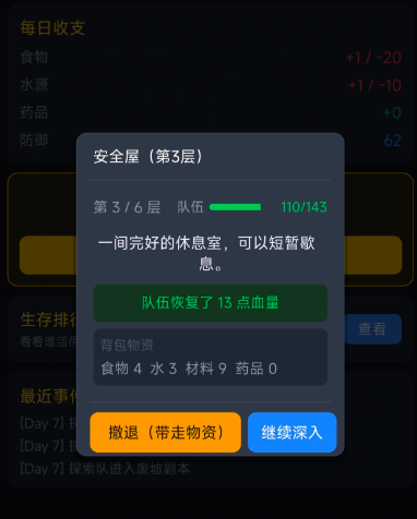 副本系统开启后,玩家可进入丧尸巢穴开展探索。探索进度越高,遭遇敌方单位的概率越大。战斗判定基于双方数值对比:敌方武力值与我方防御值进行实时比拼。成功通关后可获得食物、水、材料及药品等奖励。所有战利品需在撤出巢穴后方可存入仓库。探索过程中支持自主选择:达成阶段性收益后可随时撤离,亦可继续深入。但需注意,若未达100%探索完成度且遭遇击杀,已获取物资将全部清零。因此每次行动前务必评估当前战力匹配度。撤出后所有物资均显示于背包界面,鉴于初期资源极度紧张,每次探索带回的材料应优先用于解锁核心功能模块,此为资源规划的第一优先级。