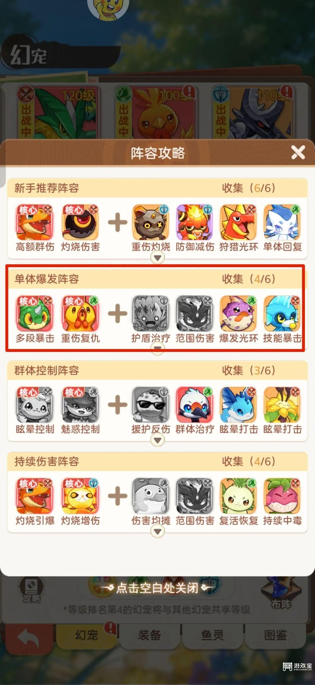 3、队伍中的核心有了,还需要搭配两个其他的宠物。前期不能使用推荐阵容中的大树和魅影儿,因为后两个UR需要的卡池等级很高,前期刷不出来,而且养四个UR,微氪是承受不起的,所以我们要从SR和SSR里选择另外的两个宠物。