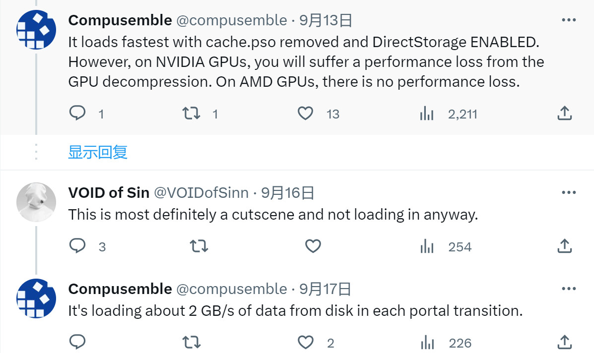 Compusemble还补充说在开启DirectStorage同时删掉cache.pso文件后会加载地更快。不过对于英伟达GPU,开启DirectStorage会造成性能损失,而在AMD GPU上并没有性能损失问题。