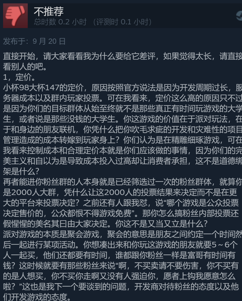 《动物派对》现已正式发售,似乎玩家对游戏并不买账,截止发稿时,Steam好评率仅为34%,差评的玩家大多数认为游戏定价太高,和游戏质量不符,还有部分玩家认为延迟严重。也有玩家给出好评,认为整体质量不错,游戏好玩。