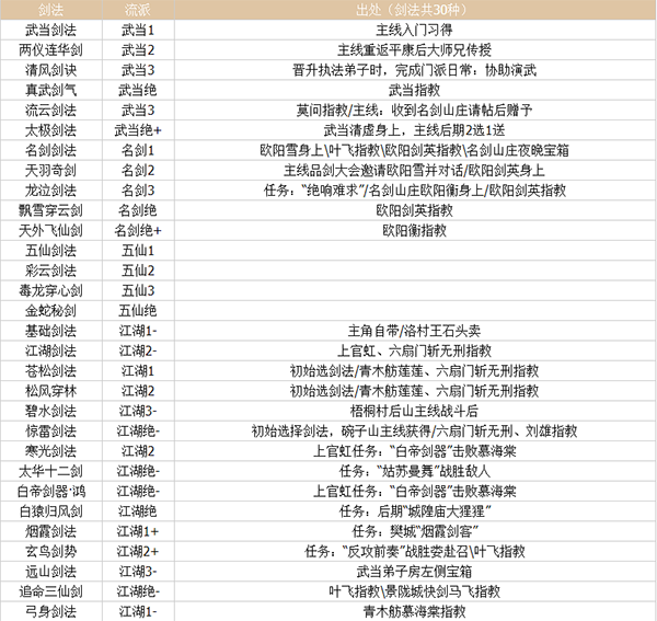 2、各位玩家可以根据下面的表格找到对应的剑法,根据出处来获得。