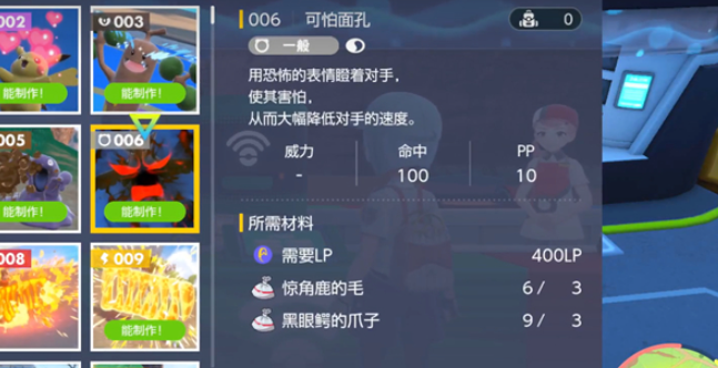 2、可怕面孔,降低敌方两级速度,需要400LP、惊角鹿的毛*3、黑眼鳄的爪子*3。