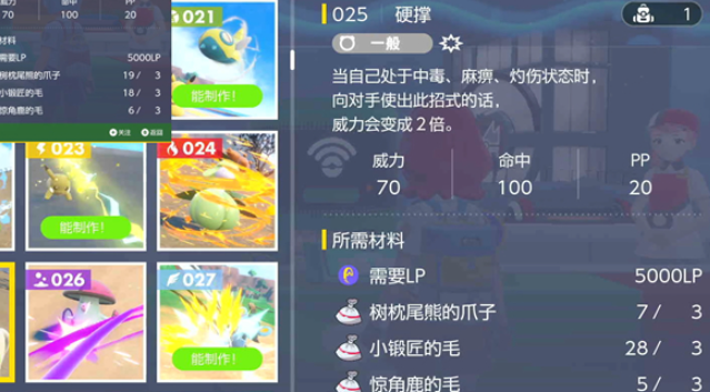 4、硬撑,70威力处于毒烧麻时威力翻倍,需要5000LP、惊角鹿的毛*3、小锻匠的毛*3、树枕尾熊的爪子*3。