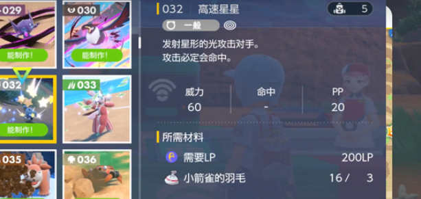 5、高速星星,60威力攻击必中,需要200LP、小箭雀的羽毛*3。