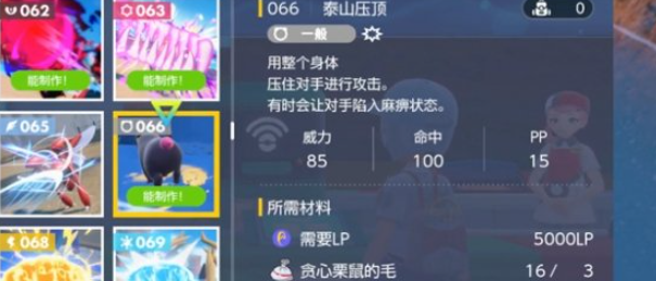 8、泰山压顶,85威力概率麻痹对手,需要5000LP、贪心栗鼠的毛*3、保姆曼波的黏液*3、咬咬龟的爪子*3。