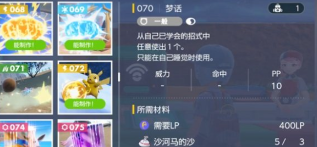 9、梦话,睡觉时使用一个已学会技能,需要400LP、沙河马的沙*3、呆呆兽的爪子*3.