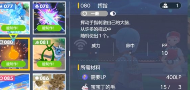 10、挥指,随机使用一个招式(所有技能里挑一个),需要400LP、宝宝丁的毛*3、小福蛋的掉落物*3。