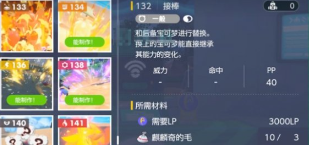 16、接棒,替换后续宝可梦,并且其继承前面宝可梦的能力变化,需要需要3000LP、伊布的毛*3、麒麟奇的毛*3。