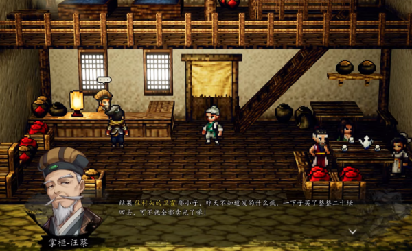 2、玩家前往地图右下方可以找到客栈,进入客栈后和掌柜对话得知高粱酒已经卖完了。